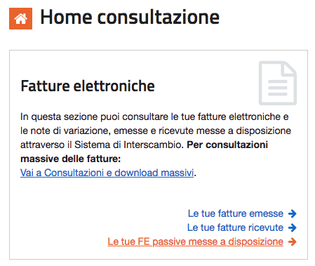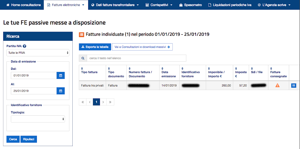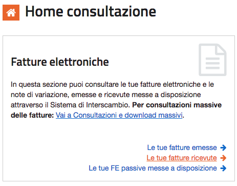 Ed è proprio quest’ultima la voce che ci interessa. Cliccando sul link compare una pagina dove sono visualizzati i documenti ricevuti negli ultimi giorni e il solito menu per la ricerca su un intervallo temporale, per partita IVA del fornitore ecc.